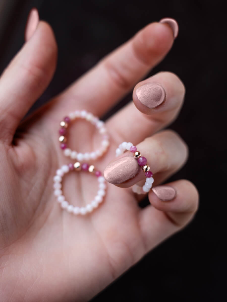Ręcznie wykonany pierścionek z różowym turmalinem, opalem i hematytem w różowym złocie na elastycznej gumce. Jest świetnym uzupełnieniem bransoletek Harmonii i Harmonii Mini.