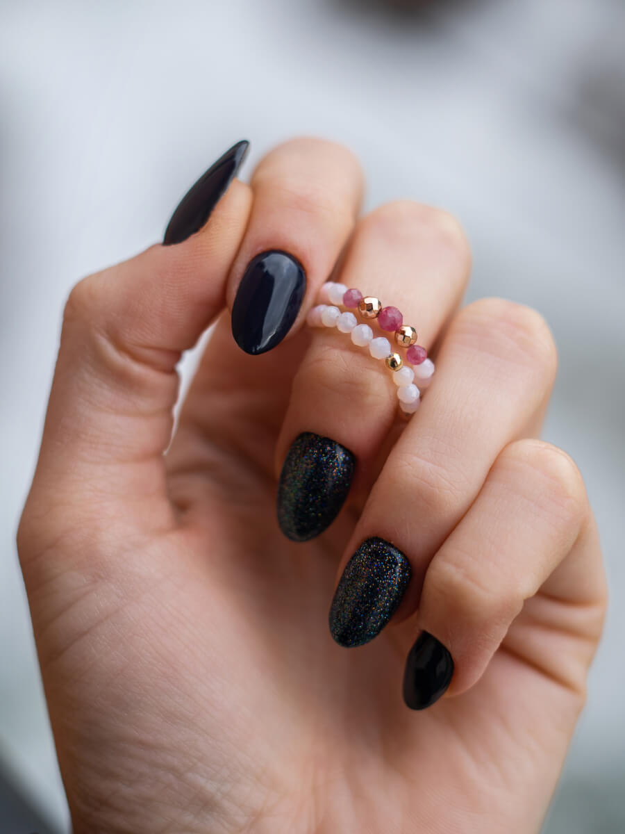 Zestaw delikatnych, różowych pierścionków elastycznych z opalem, turmalinem i złotym hematytem. W skład zestawu wchodzą