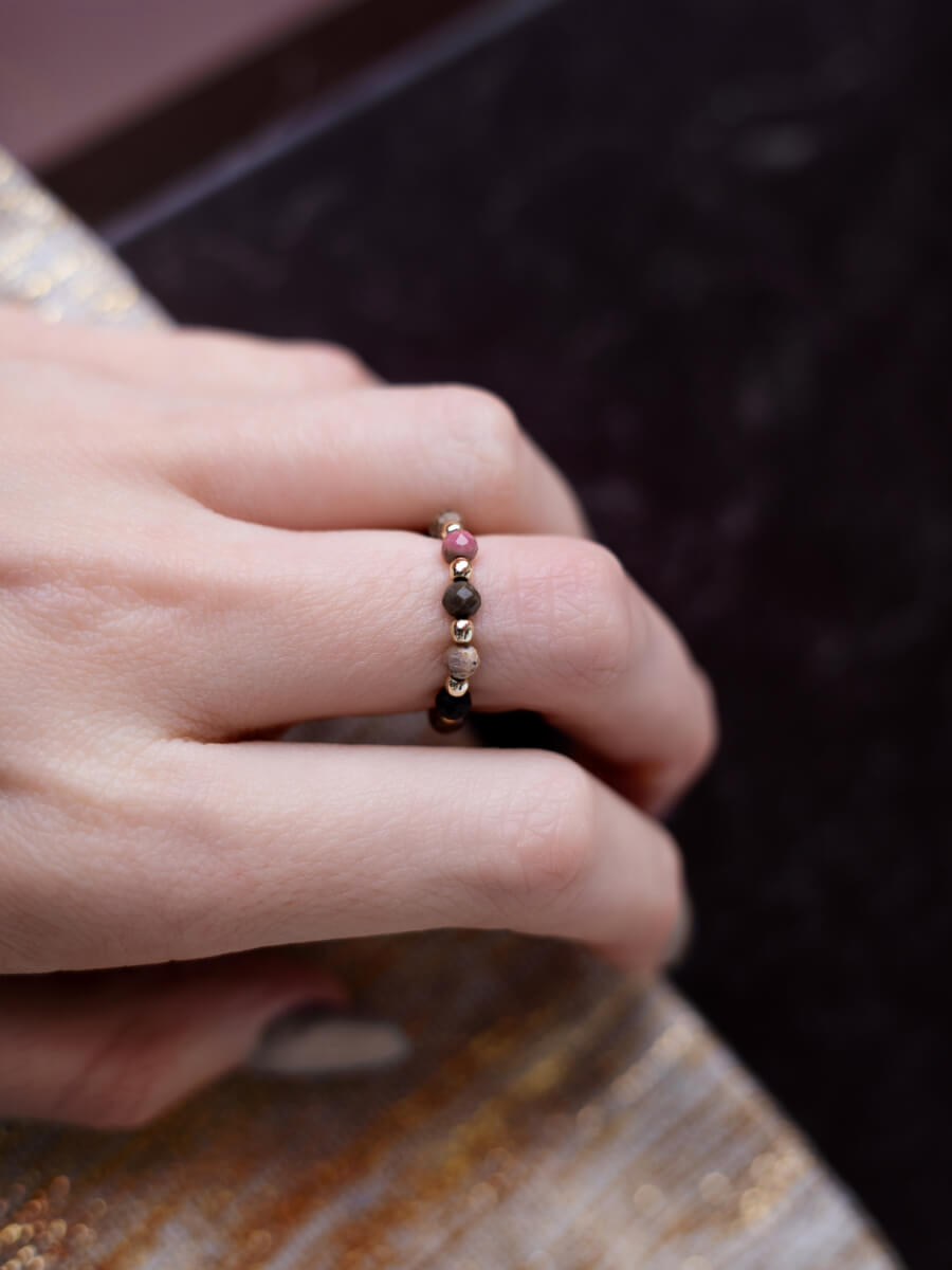 Subtelny zestaw pierścionków na gumce, składający się z pierścionków z rodonitem i złotym hematytem. W skład zestawu wchodzą: